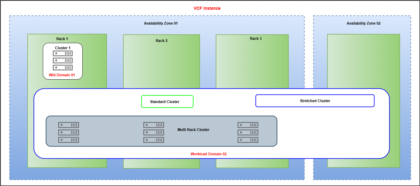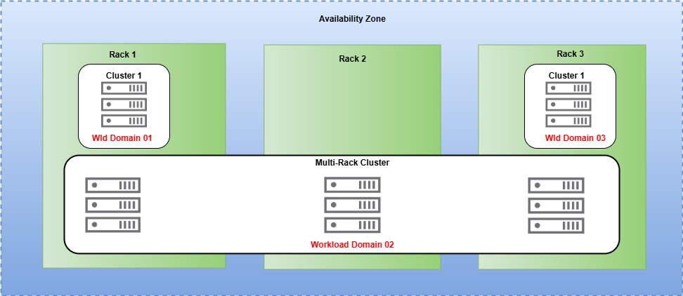 In the example provided below, you have 2 single-clustered workload domains that are deployed in a single rack. Then you have workload domain 02 that has multiple clusters, and the clusters span across the racks. Also, workload domain 02 can have another standard cluster that is deployed in a single rack.