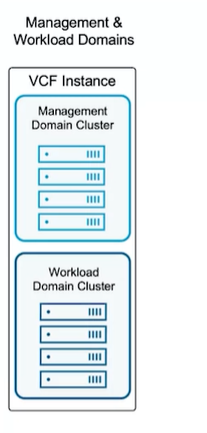 A VCF management domain with one or more virtual infrastructure (VI) workload domains represents a VCF instance. Each VCF instance is designated by having a single management domain. In a VCF instance, you add additional VI workload domains to scale that up. The management domain and the VI workload domain can have a single cluster or can be multi-clustered.