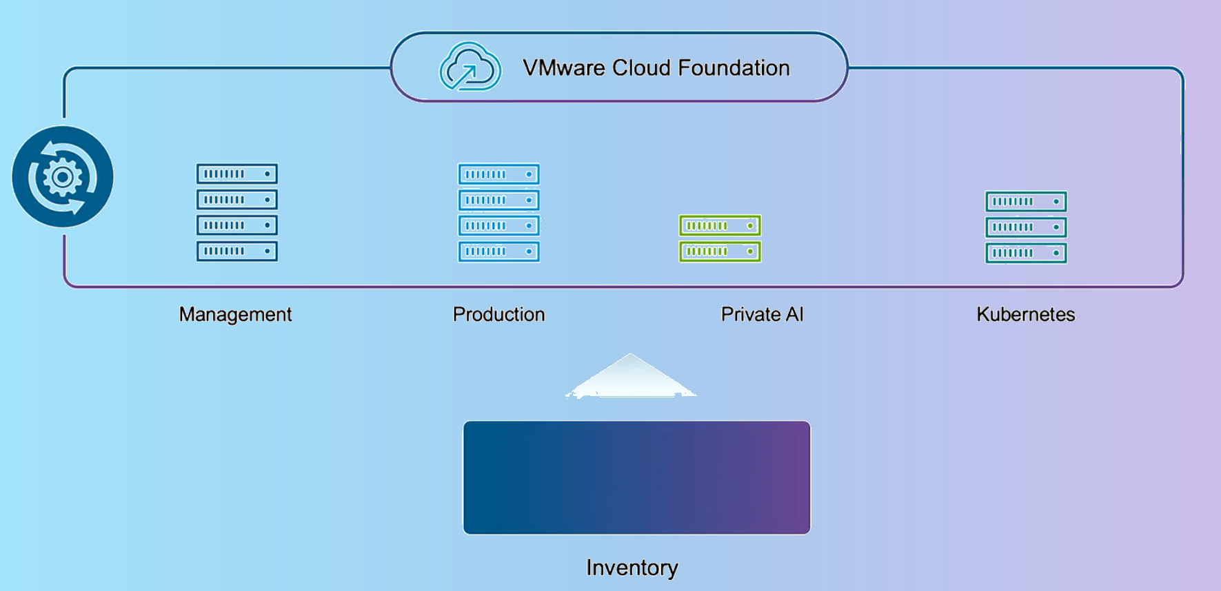 Once the ESXi hosts have met the prerequisites, a management domain is created on a 4-host cluster (typically). To run the business applications (VM/K8s or private AI), you create a VI workload domain. Based on the business requirements, you can run the VMs, containers, and private AI workloads in the same workload domain or have a dedicated domain for each one of them. In the case of the latter, each workload domain is isolated behind its own vCenter server.