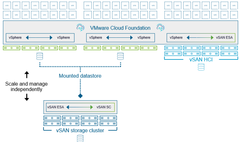 On top of rack resiliency, VCF also supports a vSAN storage cluster (previously known as vSAN Max) only. In this deployment model, you build a storage cluster in one rack and then mount the storage provided by the storage cluster onto other clusters deployed across the racks.