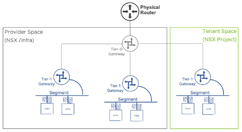 - Tier-0 Gateway: The Tier-0 Gateway is essentially the same as the provider gateway in the VPC Networking model. It connects the physical infrastructure to the virtual network. It supports both dynamic and static routing, advertising the network ranges of the virtual network. The Tier-0 Gateway is always managed by the provider admin.