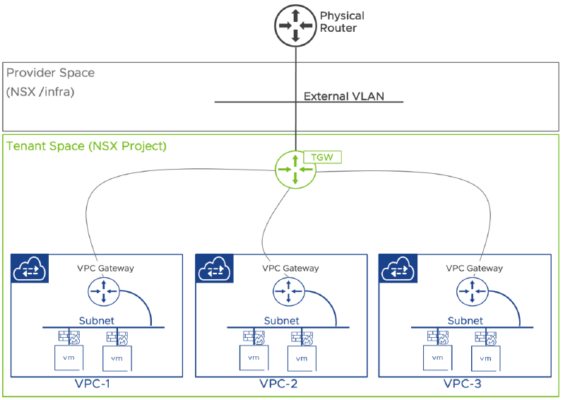 - Provider Gateway (Tier-0 Gateway): The provider gateway is a virtual router that connects the virtual network to the physical infrastructure. It handles dynamic or static routing to the physical network, advertising the network ranges of the virtual network, including public subnets, NAT IPs, and load balancer VIPs. In VCF 9.0, the provider gateway is essentially the same as the Tier-0 or VRF gateway found in the NSX segment networking model. The provider gateway can be shared among one or more tenants, enabling them to link their VPCs to the physical fabric via the transit gateway.
