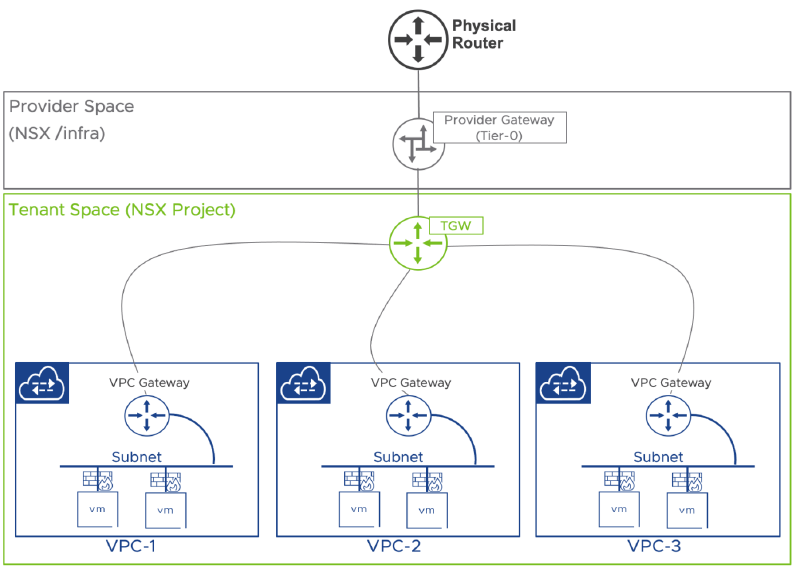 - Provider Gateway (Tier-0 Gateway): The provider gateway is a virtual router that connects the virtual network to the physical infrastructure. It handles dynamic or static routing to the physical network, advertising the network ranges of the virtual network, including public subnets, NAT IPs, and load balancer VIPs. In VCF 9.0, the provider gateway is essentially the same as the Tier-0 or VRF gateway found in the NSX segment networking model. The provider gateway can be shared among one or more tenants, enabling them to link their VPCs to the physical fabric via the transit gateway.