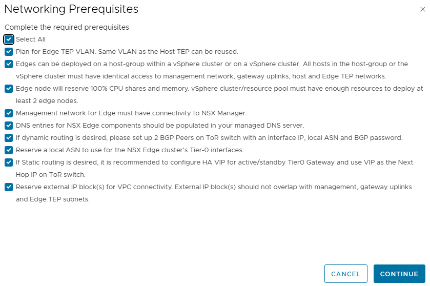Ensure that you have met all networking prerequisites before proceeding with the deployment. This interface is similar to what the SDDC Manager UI shows when deploying Edges.
