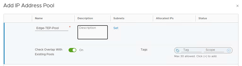Specify the IP pool name and click on Set to define the TEP subnet.