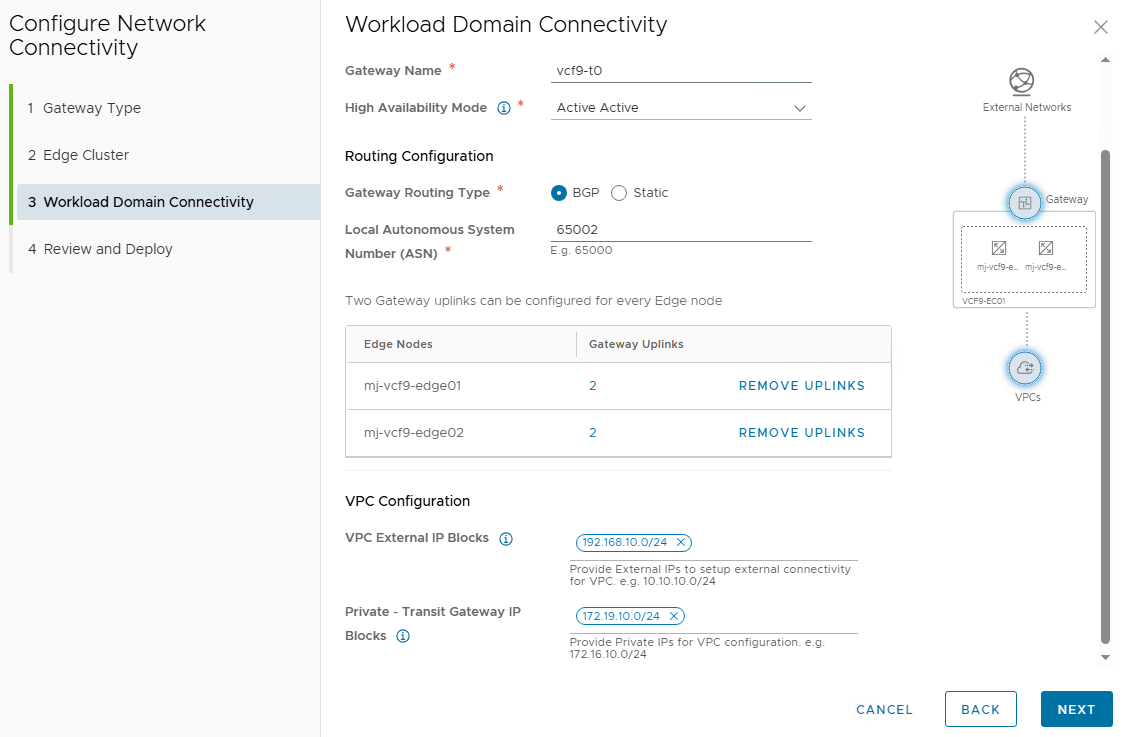 - VPC external IP blocks: These are IP ranges owned by VCF and should not overlap with other ranges in the physical network. The Tier-0 gateway will advertise them to external routers via BGP.