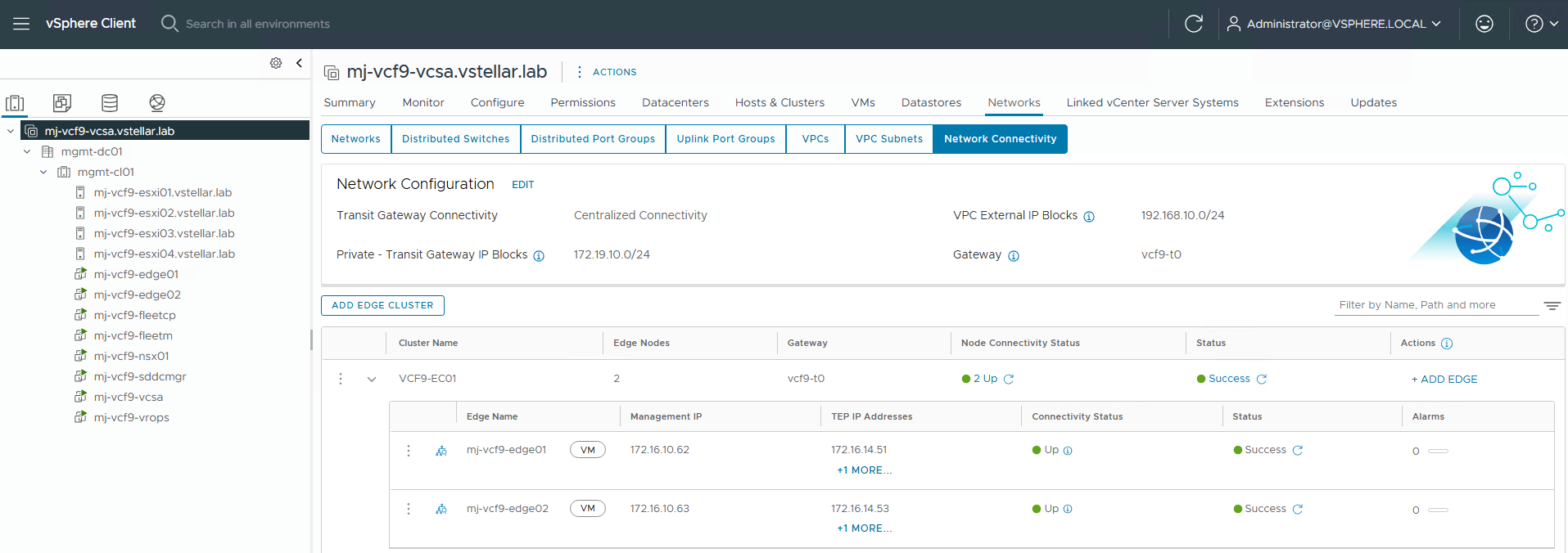 In previous VCF releases, NSX Edges were deployed through SDDC Manager using the UI/JSON. VCF-9 has introduced a newer way of deploying NSX Edge VMs, and the deployment can now be performed through vCenter UI to simplify the process, particularly for centralized external network connectivity. However, installation and configuration via the NSX Manager is still possible.