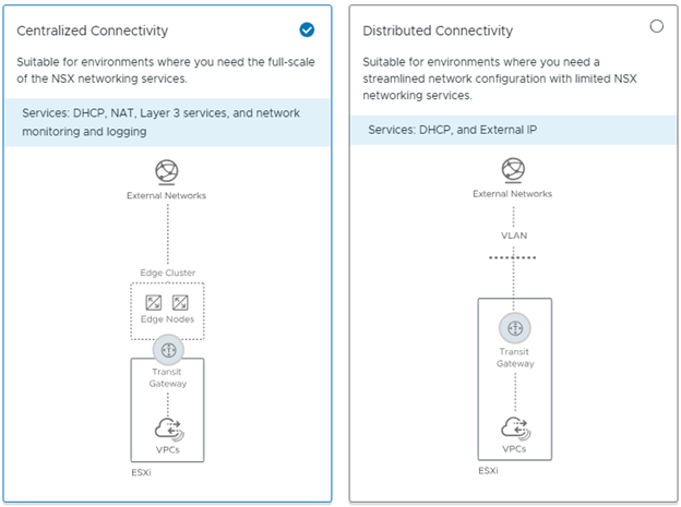 - Distributed Connectivity: In this mode, the Transit gateway can connect to physical infrastructure via an external VLAN network and doesn’t require any Edge VMs for forwarding traffic.