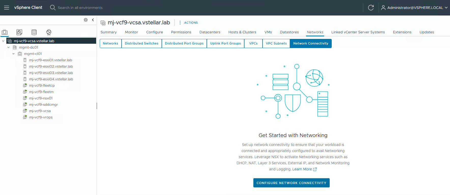 To deploy NSX Edges through vCenter, login to the vCenter UI and navigate to Networks > Network Connectivity, then click Configure Network Connectivity.