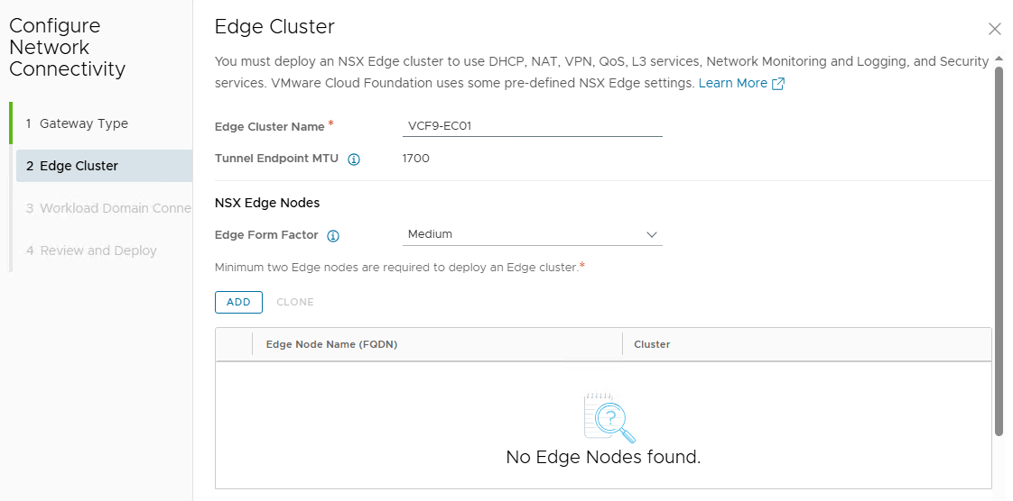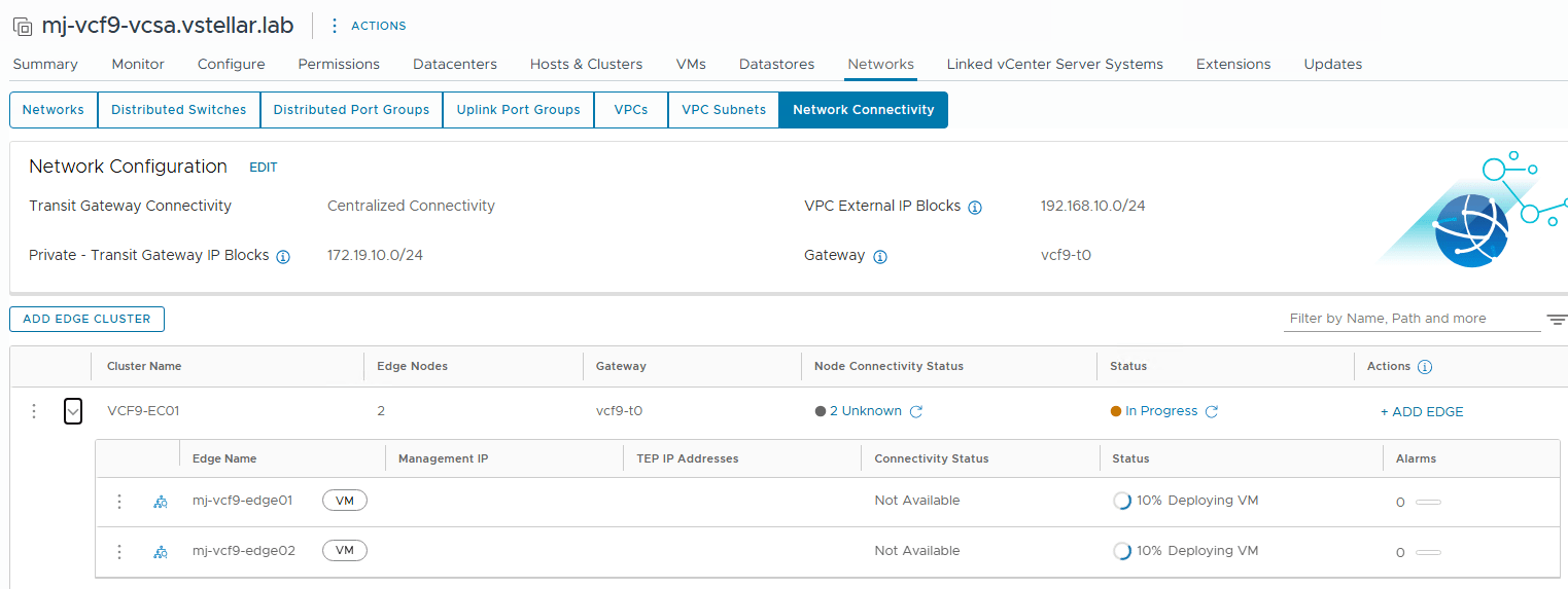 You will notice one change when deploying Edges through vCenter Server, i.e., instead of creating a tier-1 gateway, the wizard deploys a Transit Gateway. Transit gateways were introduced with VCF9 and are used to connect multiple VPCs in a project.