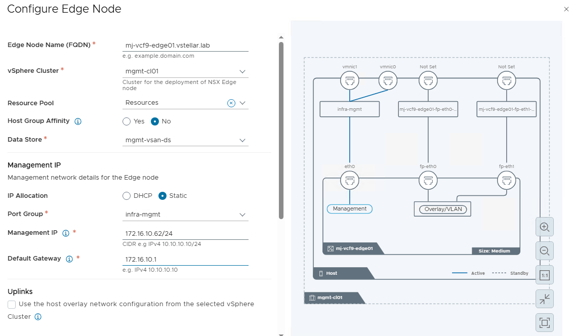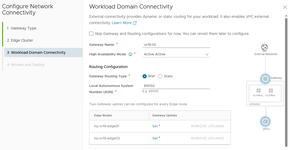 Note: If you are planning to deploy VKS in your workload domain, set the “High Availability Mode” to Active/Standby.