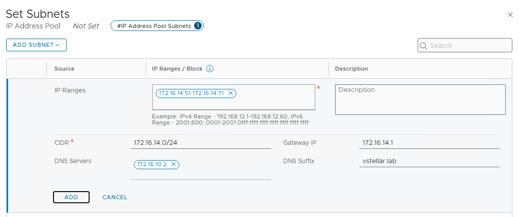 - VPC external IP blocks: These are IP ranges owned by VCF and should not overlap with other ranges in the physical network. The Tier-0 gateway will advertise them to external routers via BGP.
