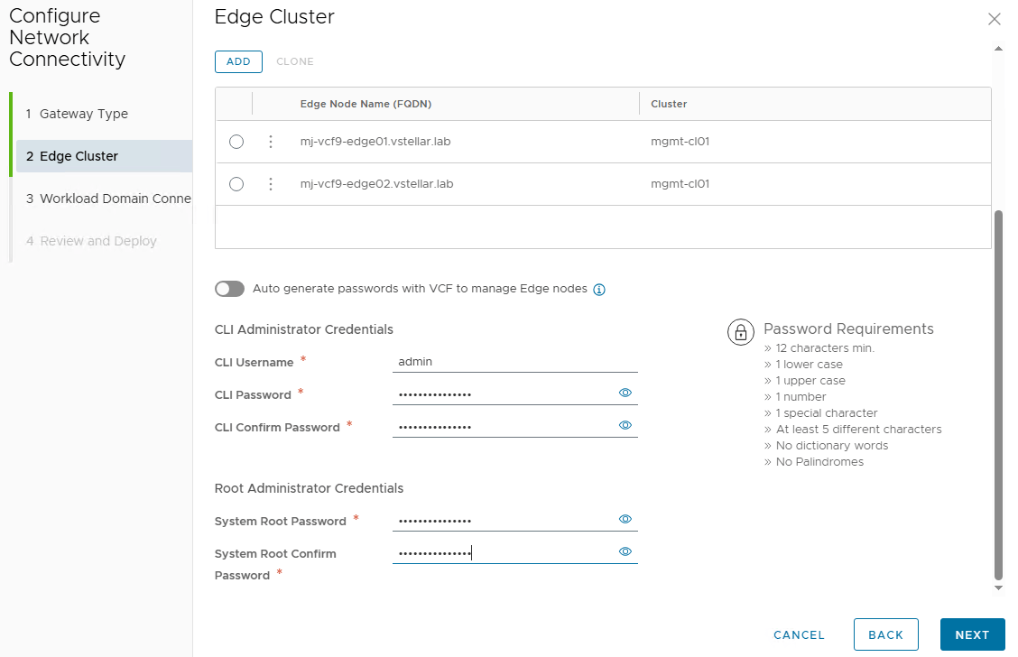 Repeat the process to add the second Edge VM in the edge cluster and configure the admin/audit and root credentials for the Edges.
