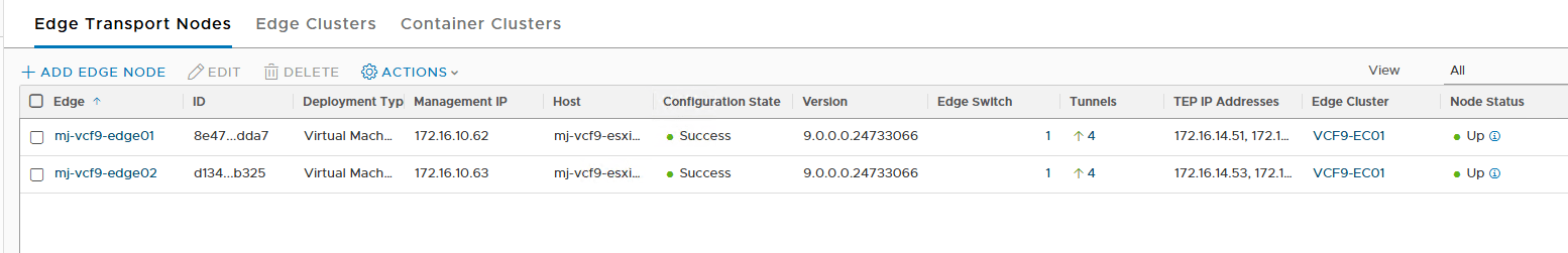 You can validate the Edge nodes deployment by logging in to the NSX Manager and navigating to the System > Fabric > Nodes tab and verifying node status and configuration state, etc.