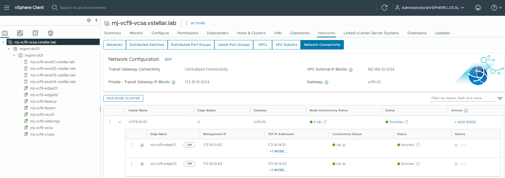 Welcome to part 4 of the VCF-9 series. The previous post in this series discussed the networking models (VPC Networking and Segment Networking) and the key differences between them. In this post, I will discuss deploying NSX Edges through a built-in wizard in the vCenter UI.