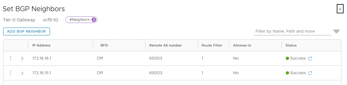 The tier-0 gateway is also created, and BGP neighbors are configured.
