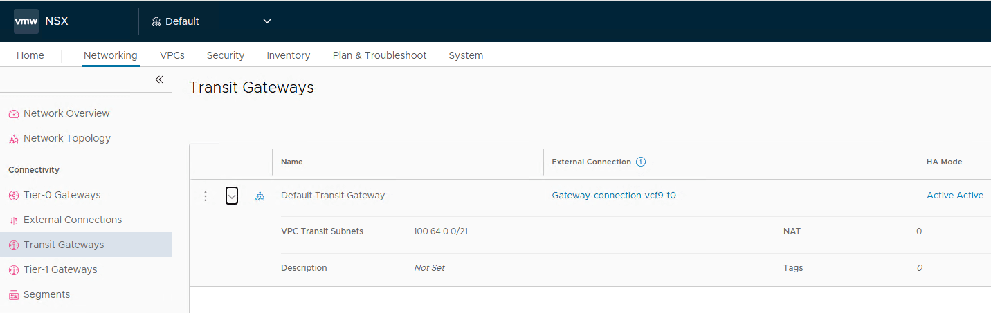 A transit gateway is auto-created and is connected to the tier-0 gateway.