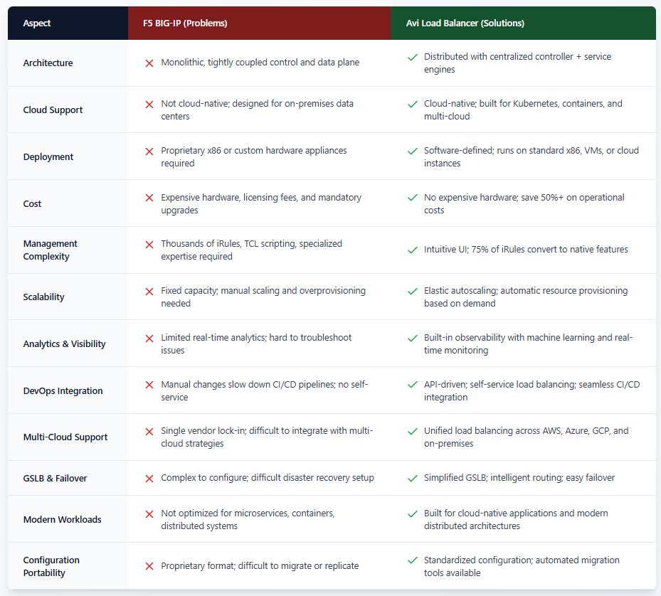 The image below summarizes the common problems with the F5 load balancer and how Avi solves them.
