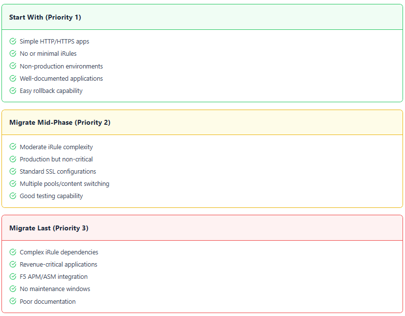 The table below provides a general rule of thumb to help you decide which F5 VIPs are good candidates for early migration.