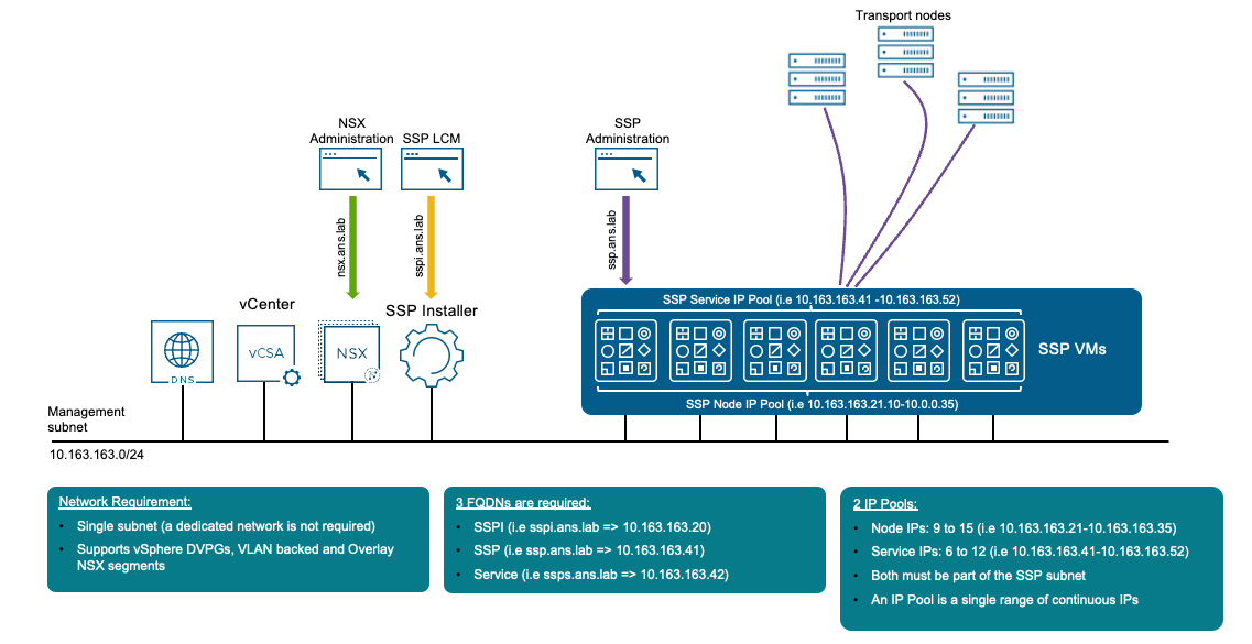 The following image (from Broadcom documentation) shows the sample network placement for the SSP. The SSPI and SSP can be deployed on the same network where other infra components (NSX, vCenter, etc.) are deployed.
