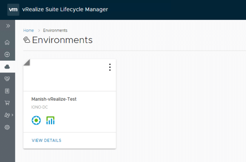 To upgrade a vRA deployment, login to vRLCM and navigate to Home > Environments and click on view details.